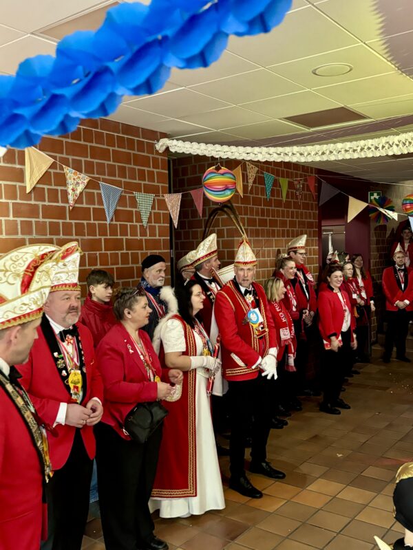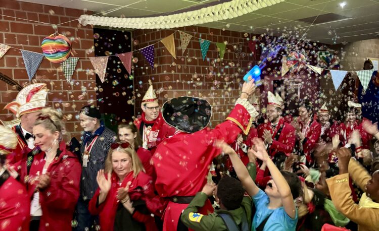 Ein Highlight war wie jedes Jahr der Besuch des Prinzenpaares der KG Rot-Weiß-Bröl mit dem Prinzen Daniel I. und seiner Prinzessin Verena I. So tanzten alle Kinder und die Mitglieder der Bröler Kalver gemeinsam und hatten oben, unten, vorne und hinten gute Laune!